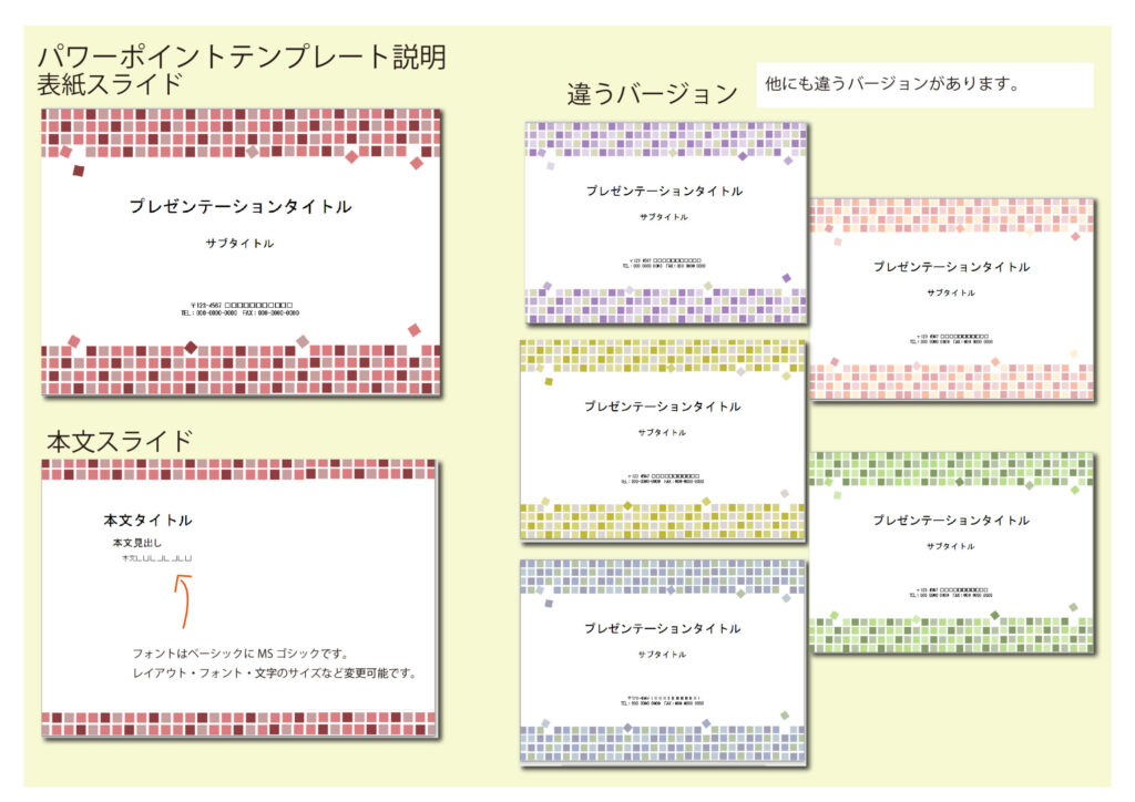 取引先に提出する資料、企画書、提案書のフォーマットにおすすめ! 緑タイルデザインのおしゃれなパワポ素材のテンプレートです。